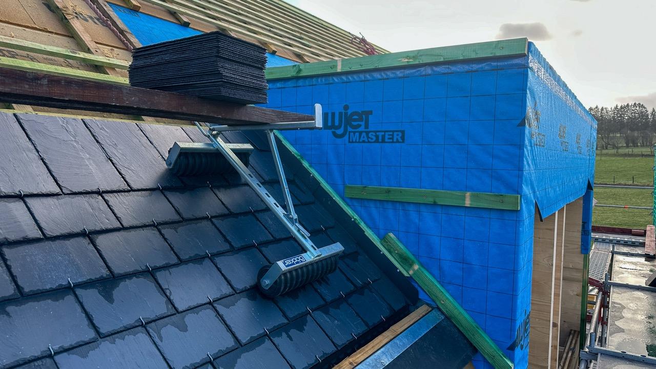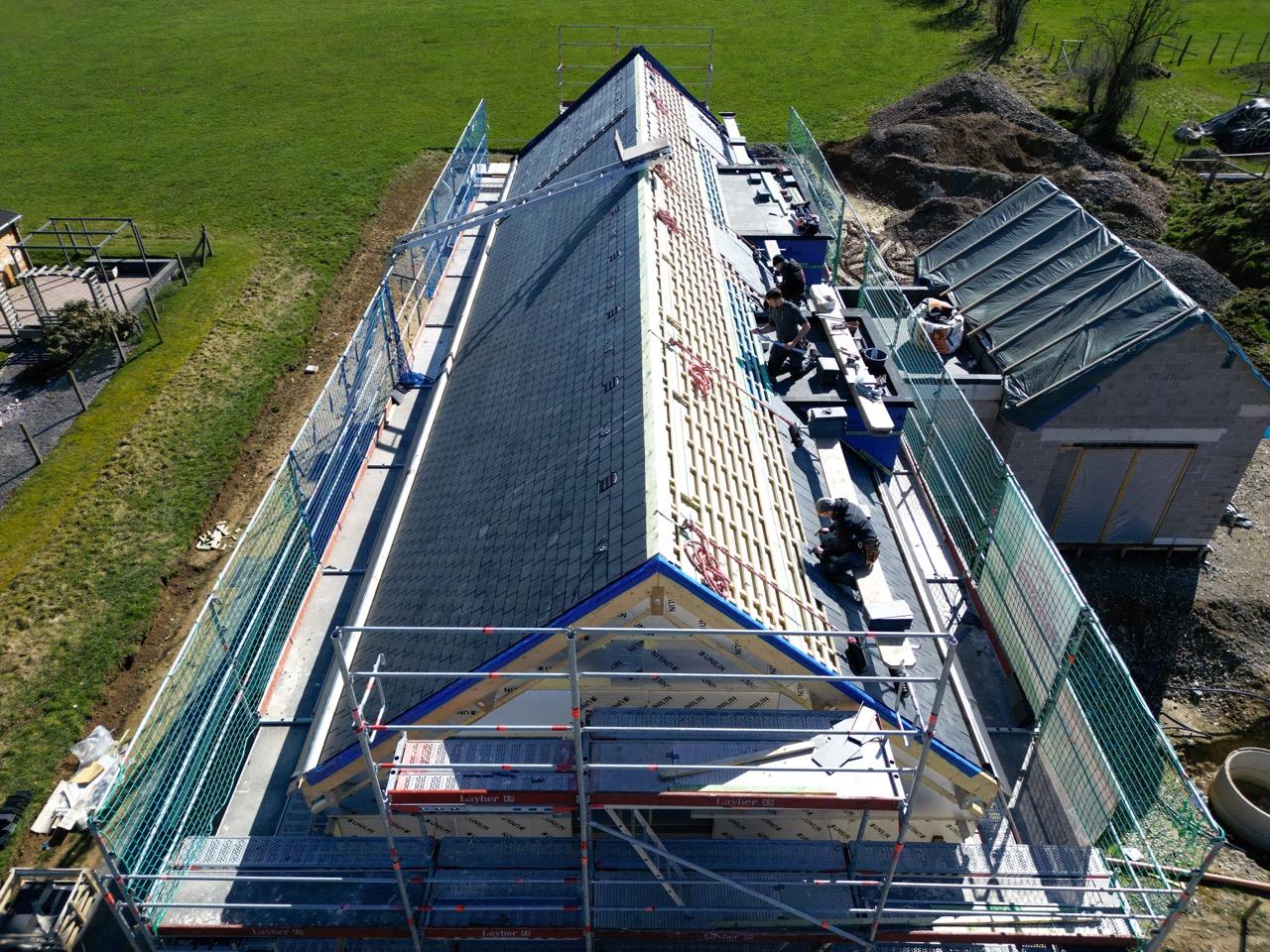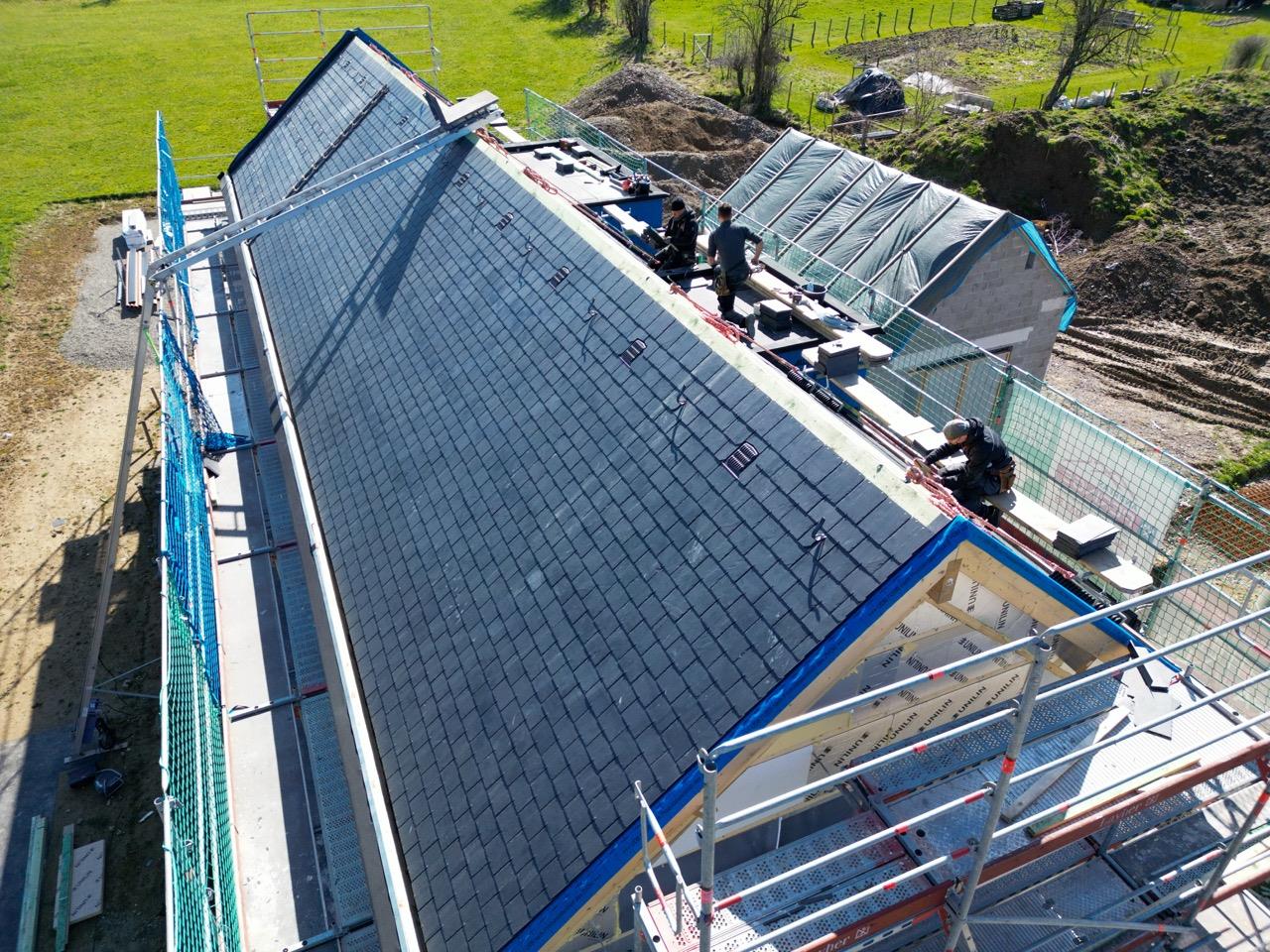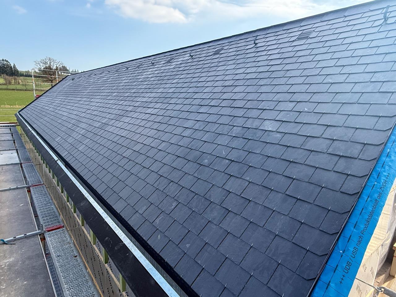 Le chantier comprend une grande toiture inclinée de 180 m², plusieurs toits plats ainsi que des lucarnes. La couverture de la toiture inclinée a été réalisée avec de l’ardoise naturelle Samaca 44 en double pose. En complément, une isolation de toiture BauderPIR de haute qualité a été mise en œuvre, garantissant une excellente performance thermique.