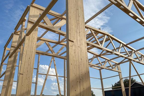 Insgesamt wurden 105 m³ Holz abgebunden, 14 Holztragwerke und 7 Fachwerkbinder vormontiert und anschließend auf der Baustelle zu einer 45 x 23 x 11 m großen Hallenkonstruktion zusammengefügt.